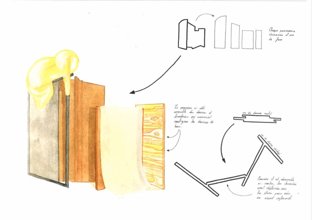 « Petit fils d’ébéniste et étudiant en design industriel, j’ai toujours cultivé un attrait pour la façon dont tradition et contemporanéité pouvait se rencontrer. Pour ce projet, redessiner l’archétype du paravent m’a interressé dans l’idée de mettre en avant les différents corps de métiers autour d’une forme nouvelle evocant leur rencontre.